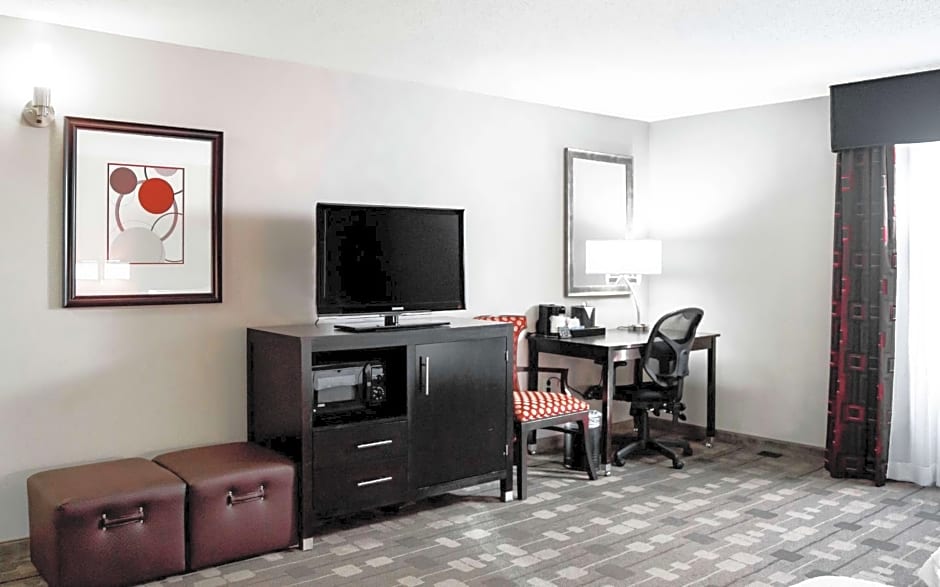 This room features a flat-screen TV with cable channels, a seating area, and a work desk.